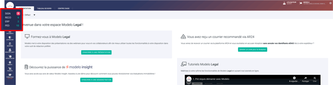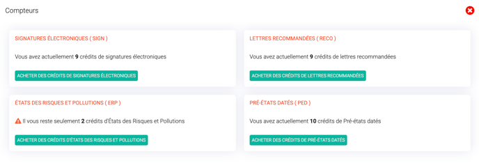 Vous pouvez à tout moment consulter le solde des crédits de signatures, de recommandés, d’ERP et PED restants sur votre compte. Depuis le menu de gauche sous le logo de votre compte, plusieurs compteurs affichent le nombre de crédits restants. Certaines têtes de réseaux et groupements ou responsable d’agence prennent en charge les achats de crédits, dans ce contexte il est possible que les compteurs ne soient pas visibles.