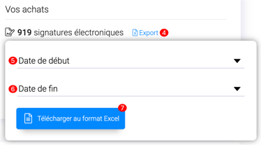 Pour consulter le détail des crédits utilisés, cliquez sur le bouton "Export" (4) puis sélectionnez la période de l'export des données souhaitée en choisissant une date de début (5) et une date de fin (6). Si vous ne choisissez aucune date, cela exportera l’ensemble de vos données depuis le début de l’utilisation de l’outil. Cliquez ensuite sur "Télécharger au format Excel" (7) :