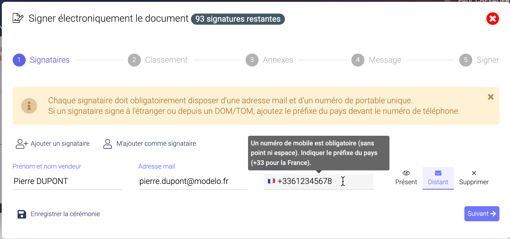 Les signataires doivent obligatoirement posséder une adresse email et un numéro de téléphone personnel.